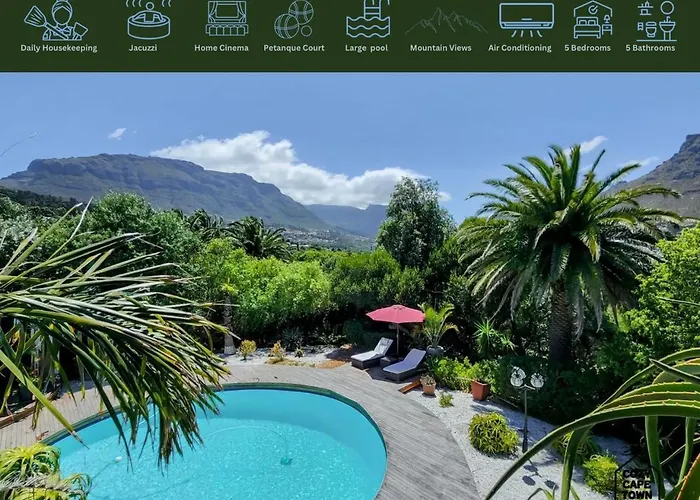 Situated nearly 25 minutes' walk from the Seal Island, Muritai Spacious 5Br Villa With Cinema, Jacuzzi, Pool And Views Hout Bay includes a private pool, as well as a Jacuzzi to relax in. Featuring access to a terrace, this Hout Bay villa is located 4.7 km from the Oudekraal Beach.